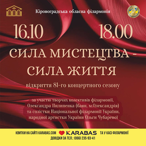 Кіровоградська обласна філармонія запрошує своїх поціновувачів високого мистетцва 16 жовтня, о 18:00, на відкриття 81-го концертного сезону під символічною назвою «Сила мистецтва – сила життя», яке відбудеться у мистецьких стінах головного концертного майданчика області.