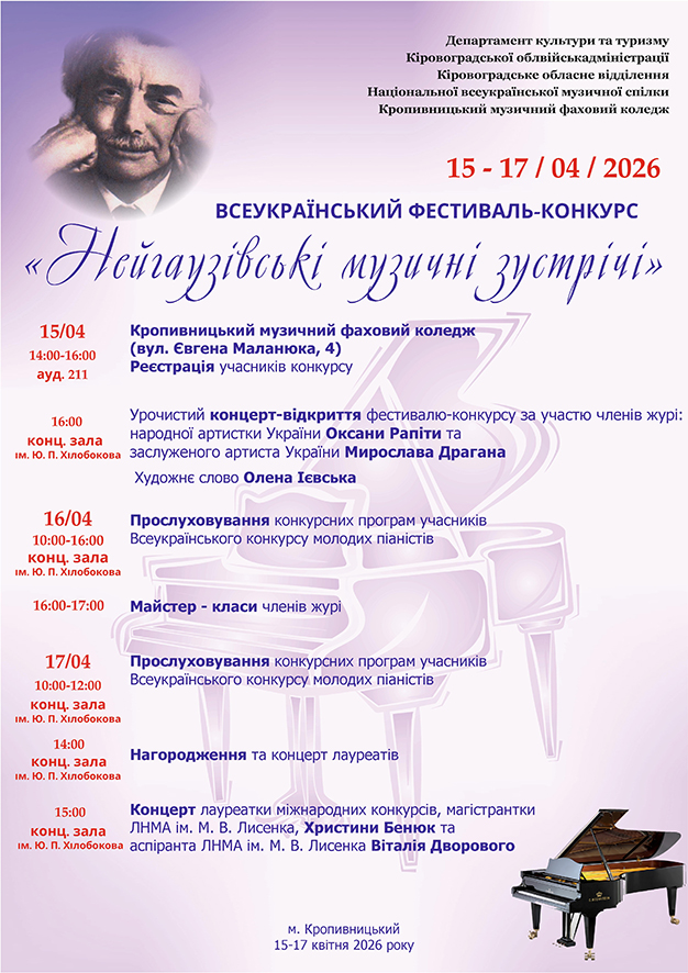 17 квітня 2026 року о 15.00 фестивальну програму продовжить концерт лауреатів міжнародних конкурсів, магістрантки Львівської національної музичної академії ім. М.В.Лисенка Христини Бенюк та аспіранта Львівської національної музичної академії ім. М.В.Лисенка Віталія Дворового (випускник Кропивницького музичного фахового коледжу, лауреат Гран-прі конкурсу).