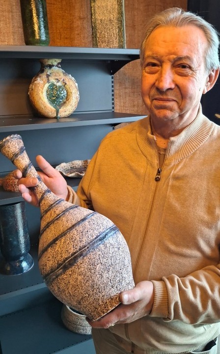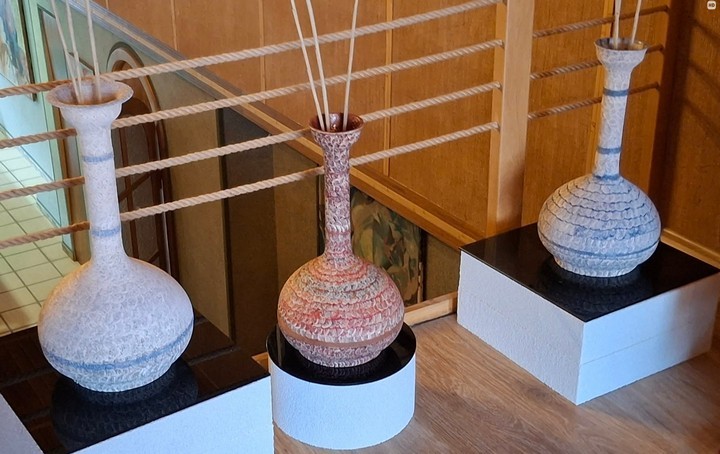 «УЦ» писала про виставку «Ваза поза формою», яка була в музеї «Місто семи імен» в Кропивницькому. Цього разу пощастило побувати в майстерні художника і дізнатися про технологічні тонкощі створення ваз. Попри те, що це кераміка, звичного гончарного круга немає. Спочатку створюється форма майбутньої вази. Окремо – суміш глини та подрібненого скла і смальти. Із цієї суміші формуються маленькі кульки, які наліплюються на форму. В одному виробі може бути використано до тисячі кульок. Вони різних відтінків, завдяки чому утворюється візерунок. Вази поміщаються в піч, де при температурі 1200 градусів кульки плавляться. Готові керамічні вироби створюють враження сплетених з ниток.