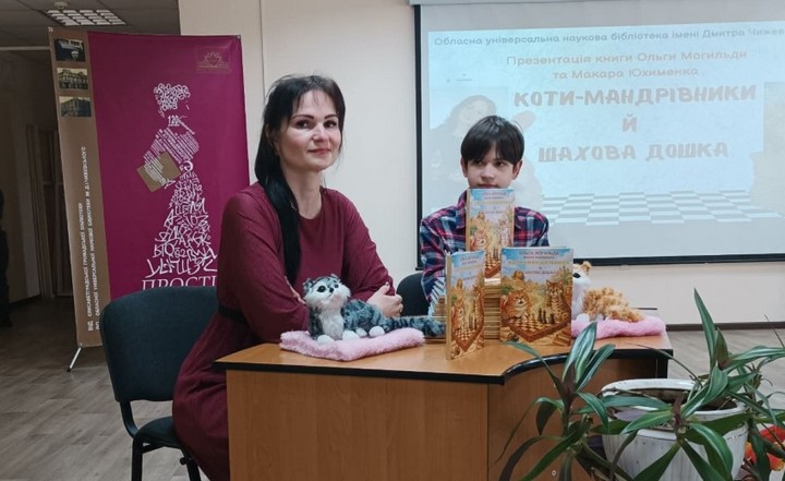 Минулої п’ятниці в ОУНБ ім. Чижевського відбулася презентація книги сімейного дуету Ольги Могильди та Макара Юхименка, мами та сина. З назви книги «Коти-мандрівники й шахова дошка» вже зрозуміло, що вона з розряду дитячої літератури. Хоча пані Ольга, педагогиня за освітою, згодом наголосила, що книга буде пізнавальною і для дорослих. Адже містить певні маловідомі наукові події.