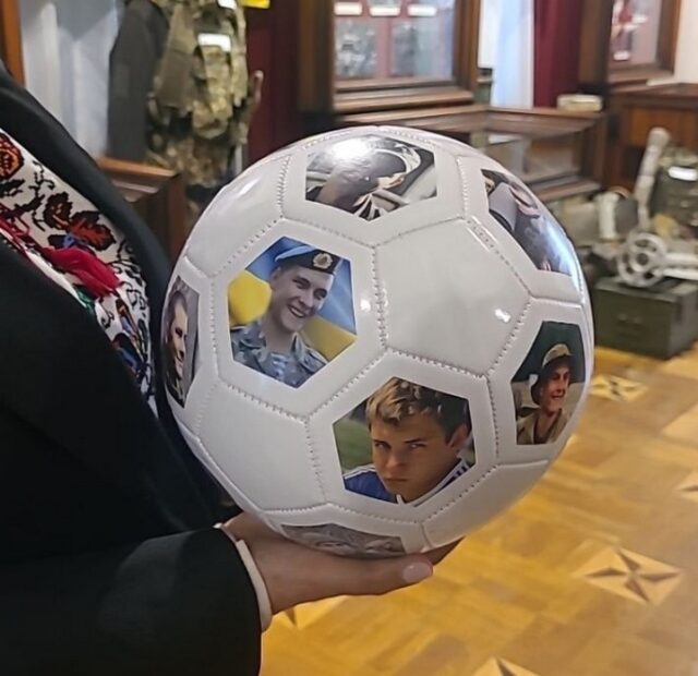 «Це футбольний м’яч зі світлинами сина. Ніби мозаїка. І там фото із цивільного й військового життя», – говорить Алла Кондакова.